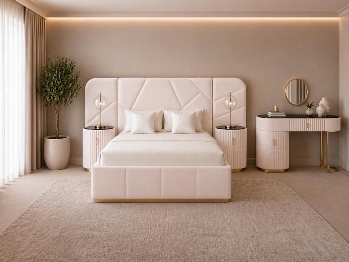 Elevate your sleeping sanctuary with the Alice Premium Bedroom Suite, a masterpiece of contemporary elegance and plush comfort. Designed for those with a refined taste, this collection features a stunning, oversized headboard with geometric velvet paneling and gold-accents that create a focal point of pure luxury in any master suite.