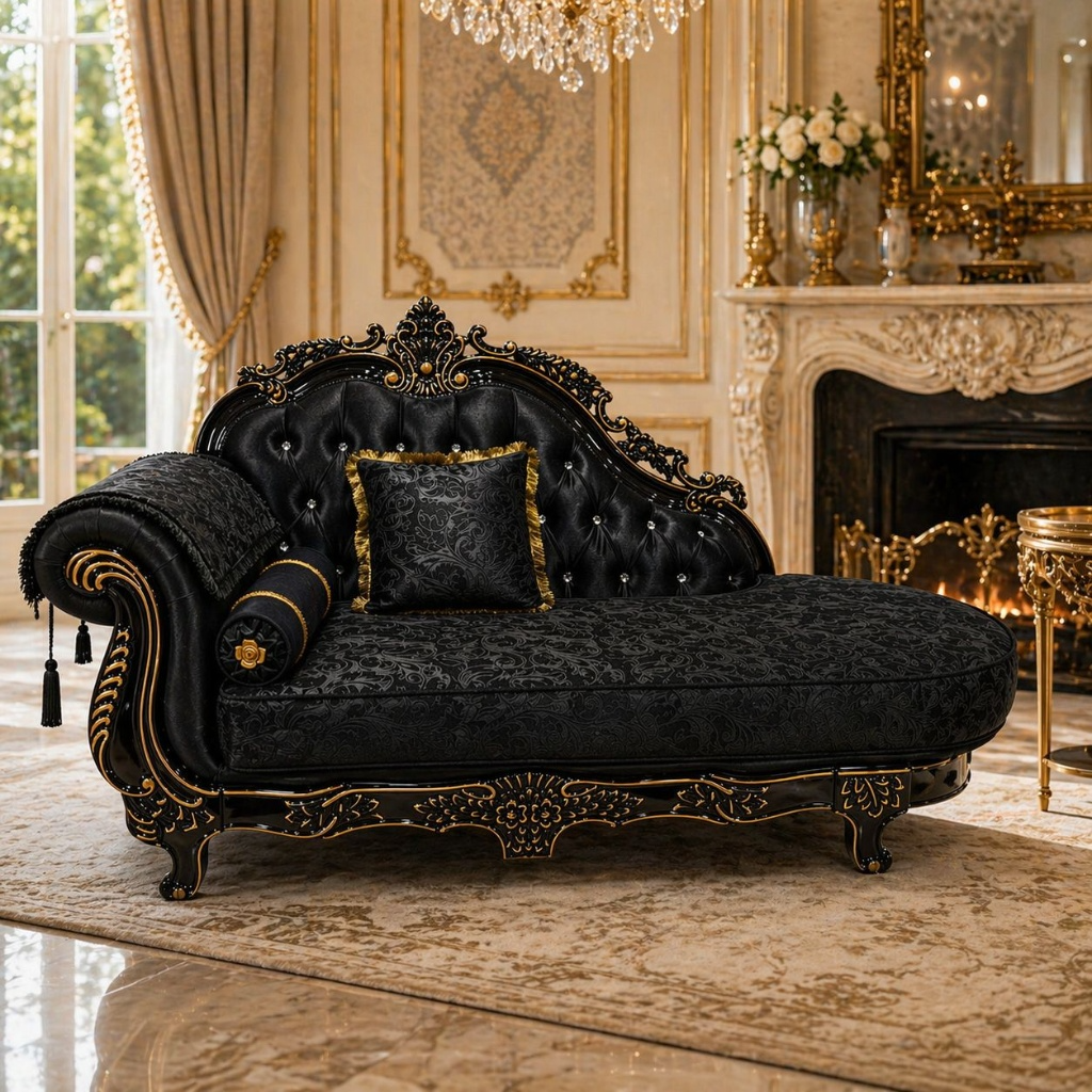 Meticulously crafted with a high-gloss ebony finish and intricate gold-gilt scrollwork, this chaise captures the essence of classic opulence. The sweeping silhouette and deep, rich damask upholstery aren’t just for show—they provide a sanctuary for total relaxation, inviting you to recline in absolute style.