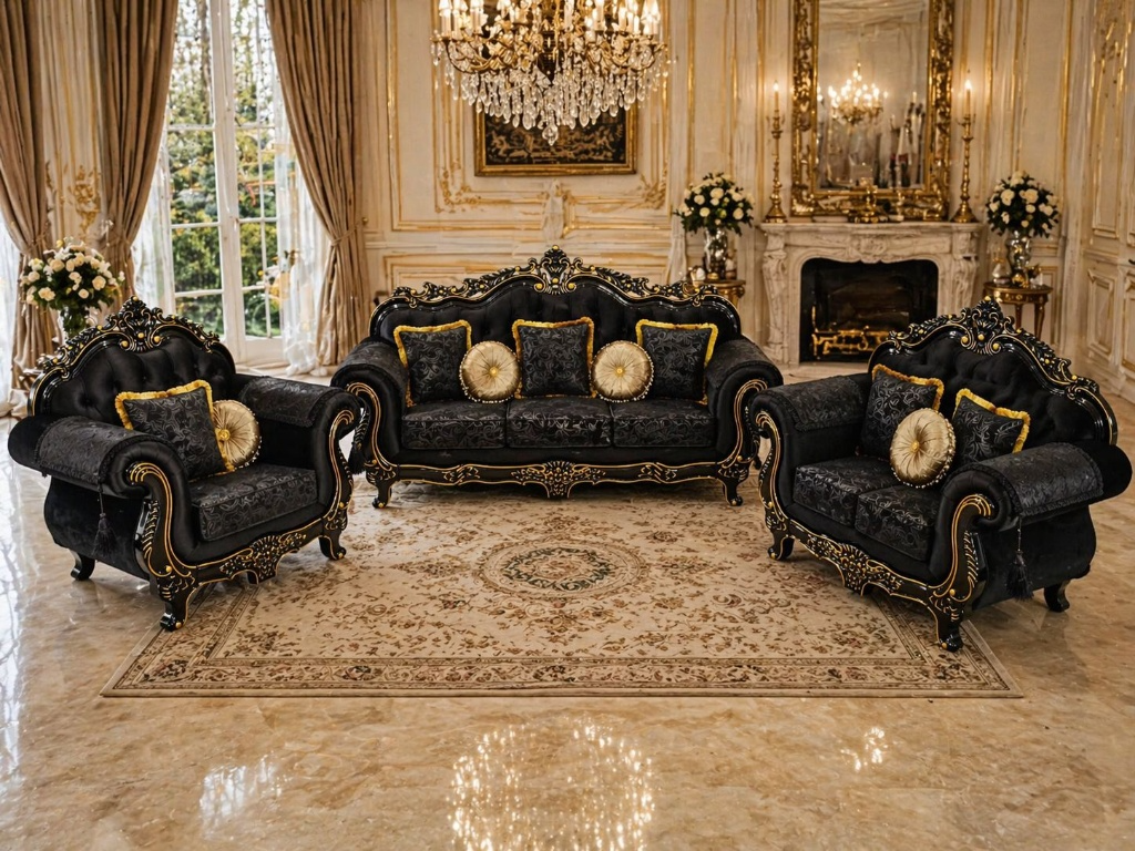 Its sophisticated look and supportive seating make it a standout piece in any living room, while the deep-buttoned tufting and plush gold-trimmed cushions provide extra comfort for watching movies, reading, or simply unwinding. The French suite combines durability with an opulent design that suits high-end luxury interiors, featuring a striking black and gold aesthetic that radiates elegance.