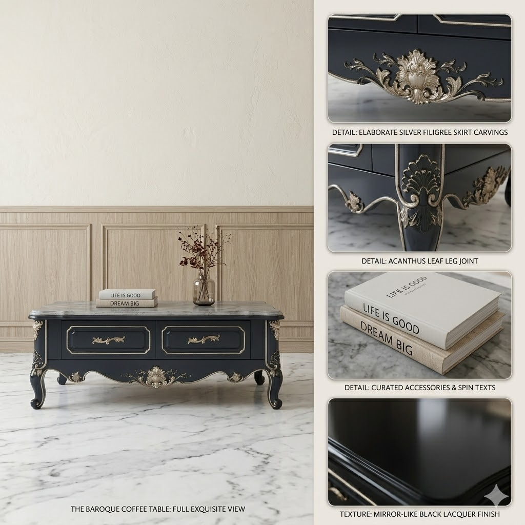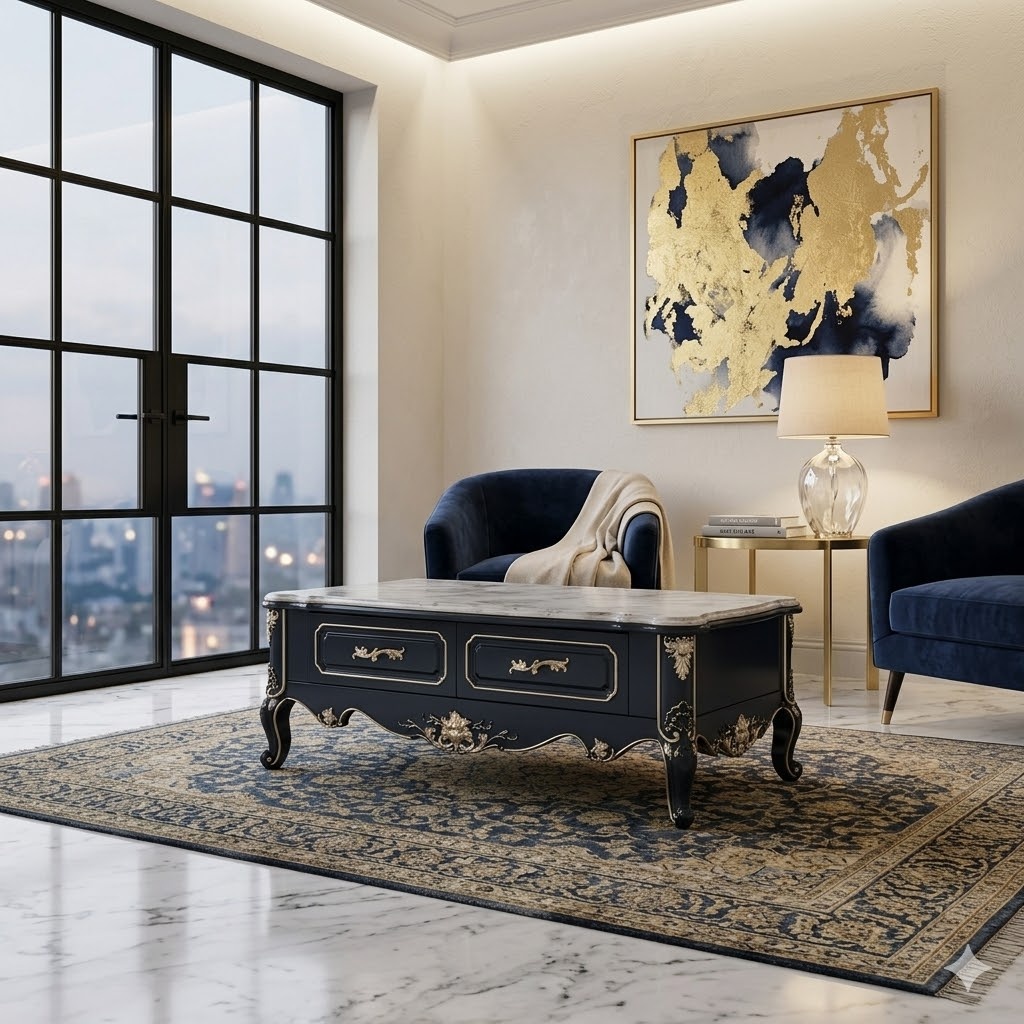 Add a touch of elegance and timeless opulence to your home with this stunning Lillie coffee table. Designed with a luxurious marble-patterned top and a deep midnight blue finish, it captures the essence of classic European artistry—symbolizing prestige, heritage, and refined living. Perfect for grand lounges and sophisticated interior decor.