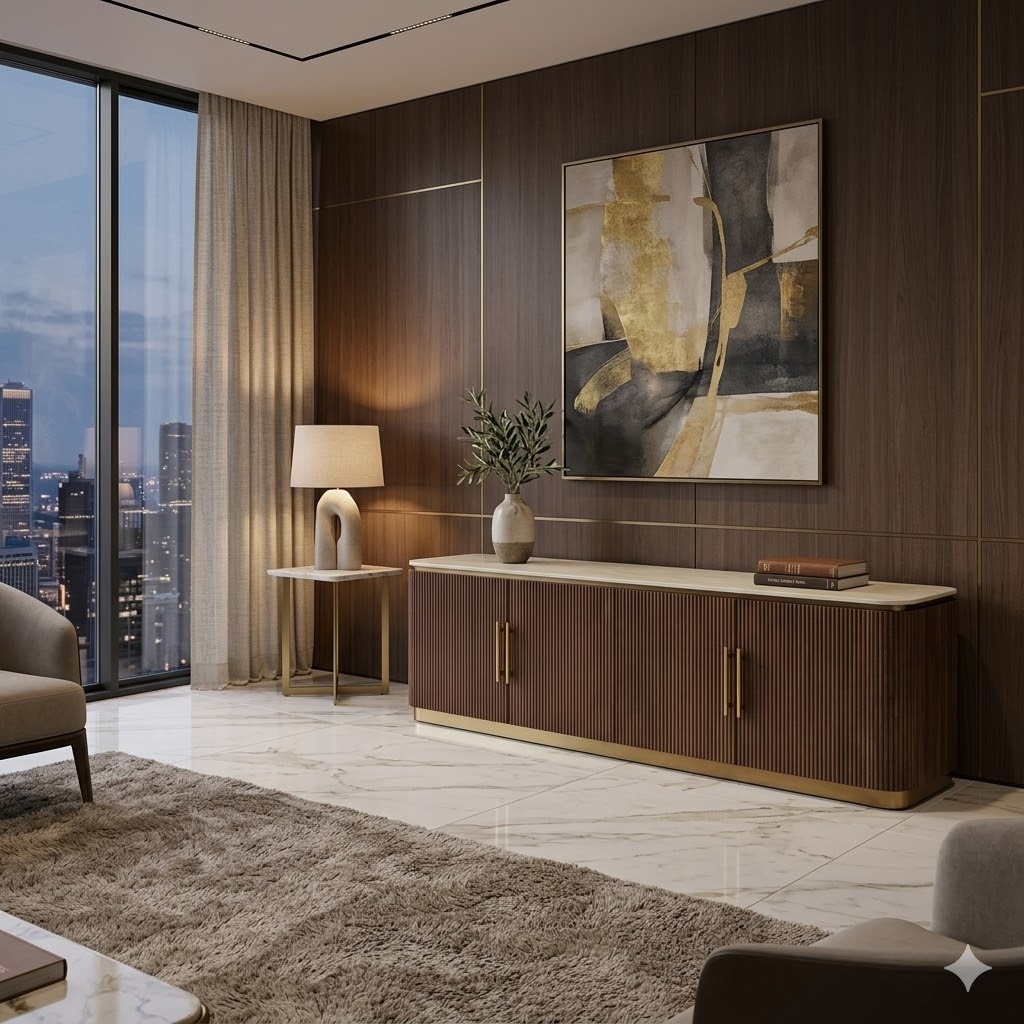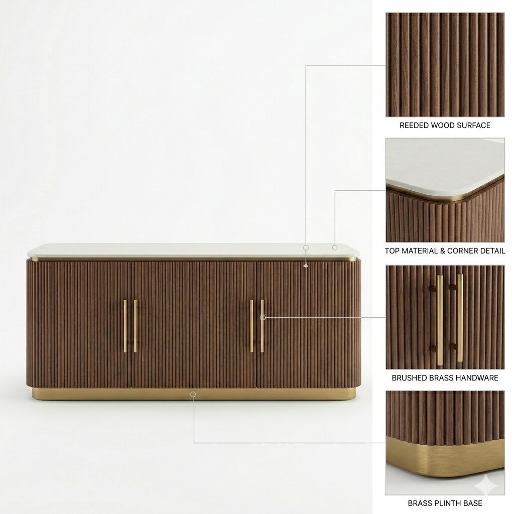 Add a touch of elegance and mid-century modern charm to your entertainment area with this stunning Pierre TV unit. Designed with a sophisticated ribbed walnut body and a radiant gold-finished plinth, it captures the perfect balance of organic texture and contemporary luxury—symbolizing warmth, stability, and refined craftsmanship. Perfect for modern homes and cozy cinema settings.