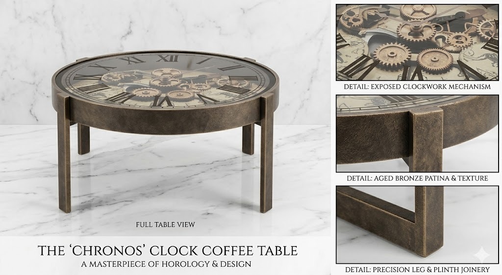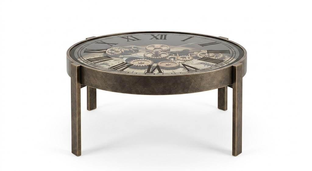 Add a touch of elegance and timeless industrial charm to your space with this stunning Rome coffee table. Designed with a vintage-inspired clock face and a sleek pewter finish, it captures the energy of classic mechanical design—symbolizing history, precision, and unique style. Perfect for modern homes and sophisticated office décor.