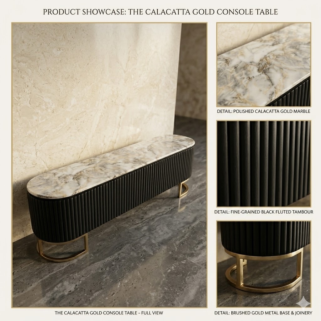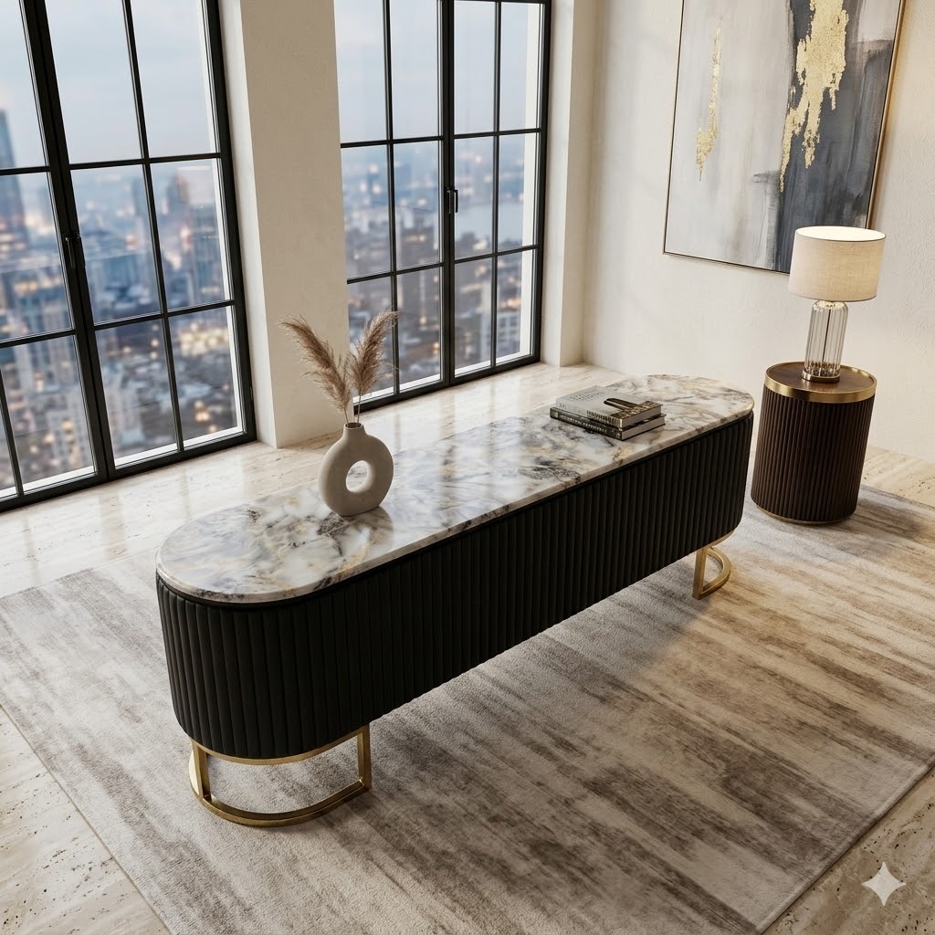 Add a touch of elegance and contemporary luxury to your living space with this stunning Saturnia TV Unit. Designed with a sleek, elongated marble top and a striking ribbed black body, it captures the perfect balance of functional design and high-end aesthetics—symbolizing innovation, sophistication, and refined style. Perfect for modern apartments and designer lounges.
