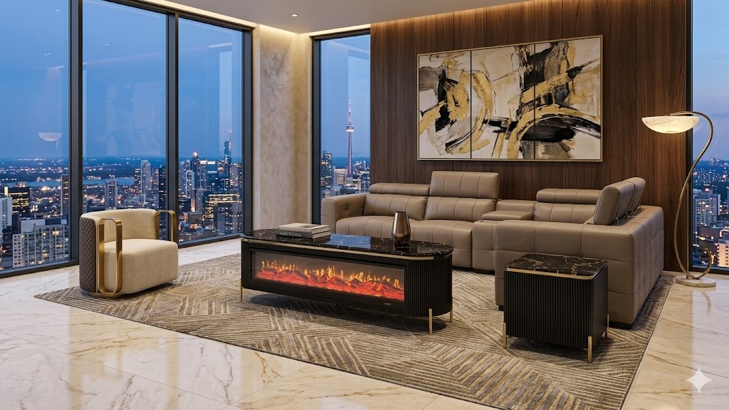 Add a touch of elegance and contemporary luxury to your living space with this stunning Sofia fireplace TV unit. Designed with a sleek, elongated silhouette and a striking ribbed black body, it captures the perfect balance of cozy ambiance and high-end design—symbolizing innovation, warmth, and sophisticated style. Perfect for modern apartments and designer lounges.